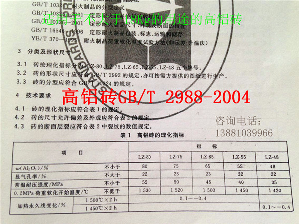 1.產(chǎn)品描述:高鋁磚***是以高鋁礬土為原料,加入部份結(jié)合粘土,經(jīng)過成型燒結(jié)而得的氧化鋁Al2O3含量大于48%的耐火磚。