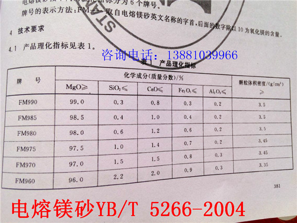 3.等級牌號:燒結(jié)鎂砂MS-92,中檔鎂砂MS-95,電熔鎂砂DMS-97。